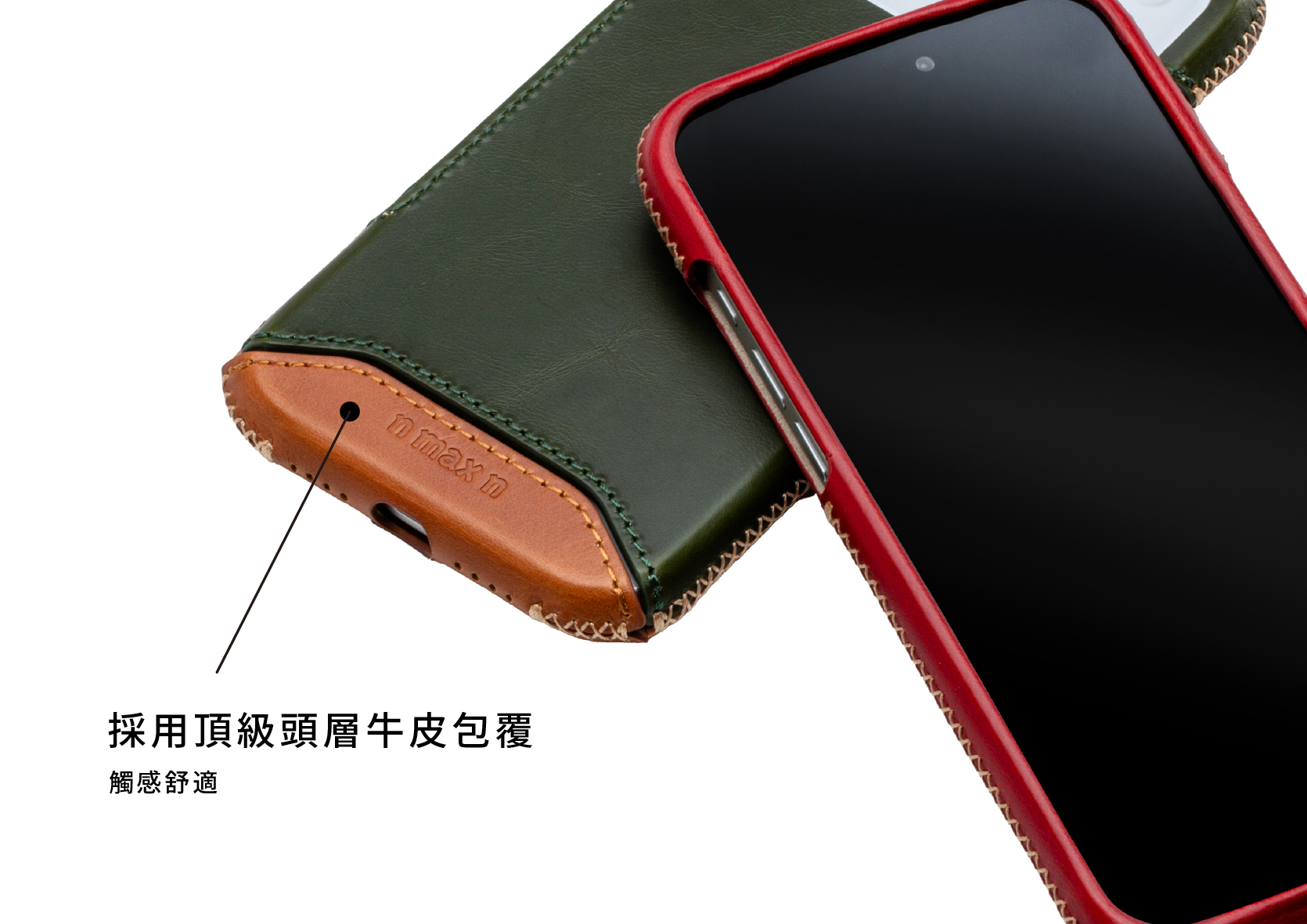 *螢幕加強防撞-使用人字縫線工法將皮革緊緊包覆於螢幕周圍一圈厚達0.8mm錳鋼防護環,手機不慎落地時藉由環狀傳導原理將撞擊力道平均擴散,降低螢幕碎裂風險