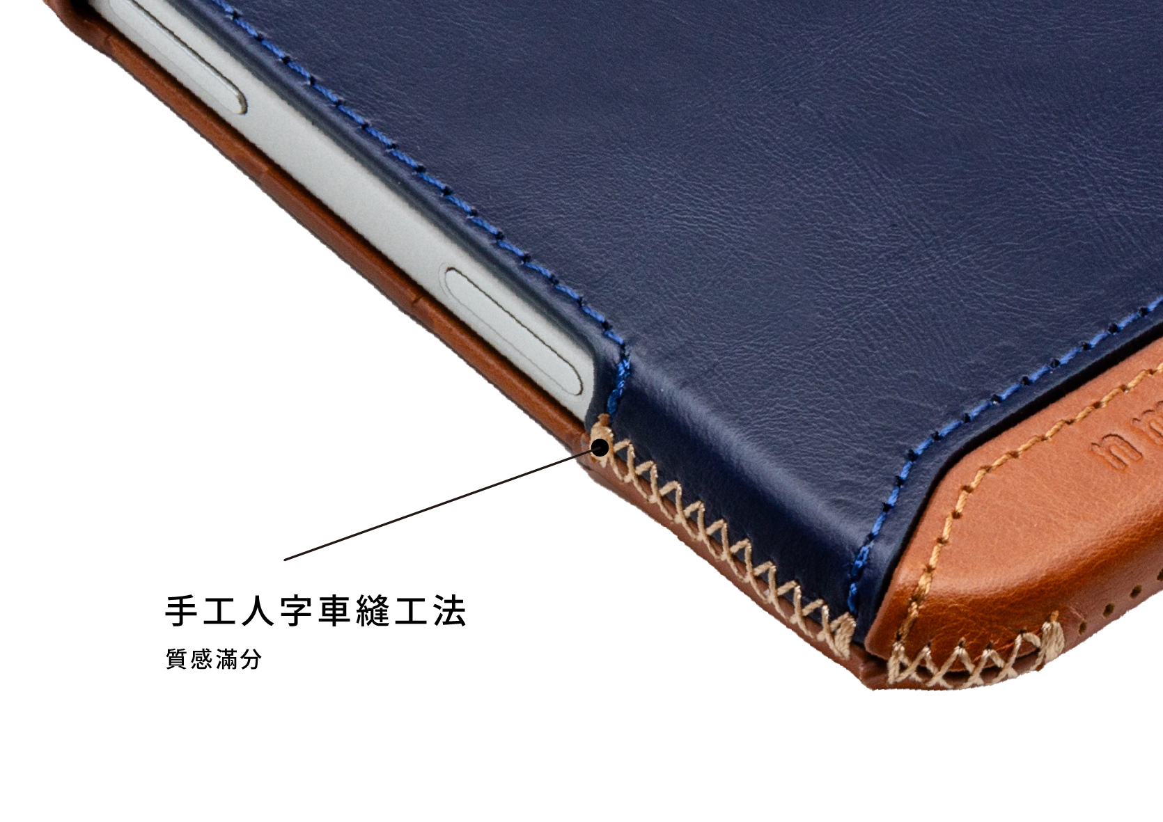 *螢幕加強防撞-使用人字縫線工法將皮革緊緊包覆於螢幕周圍一圈厚達0.8mm錳鋼防護環,手機不慎落地時藉由環狀傳導原理將撞擊力道平均擴散,降低螢幕碎裂風險